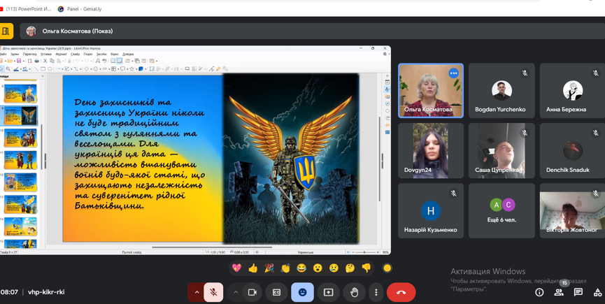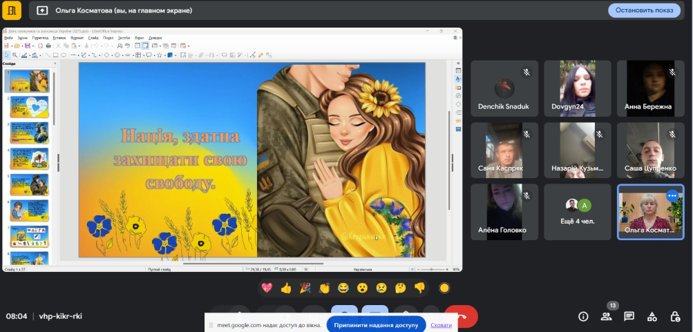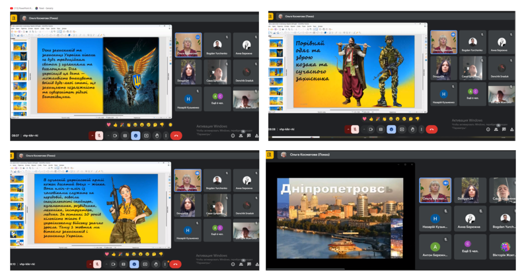 До Дня захисників та захисниць України. Проведена зустріч стала значущою подією, яка допомогла глибше усвідомити цінність свободи та незалежності нашої країни. Здобувачі освіти мали змогу обговорити роль захисників і захисниць у сучасному світі, їхній героїзм і самовідданість у боротьбі за Україну. Це свято не лише вшановує пам’ять про загиблих, а й нагадує про обов’язок кожного з нас берегти та захищати нашу державу. Обговорення важливих аспектів патріотизму і єдності спонукало молодь до активної участі в суспільному житті, виховуючи почуття гордості за свою країну. Завдяки таким заходам формуються цінності, які сприяють зміцненню національної свідомості та єдності українського народу у боротьбі за свободу.