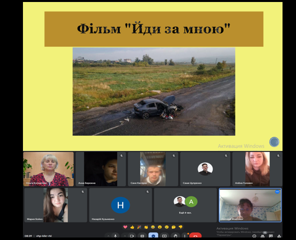 Продовжила розмову на цю тему бібліотекар Жовтоног Вікторія . Вона звернула увагу на проблемі дезинформації у ЗМІ з боку агресорів. Наголосила , що росія завжди спотворювала історію, вдавалася до брехні та маніпуляцій. Сьогодні рф і за допомогою кіно вкотре хоче перекрутити реальність. А стрічки українських режисерів можуть допомогти розповісти світові про справжність та розмір військової агресії росіян. Вплинути на світову думку, ставлення до війни та міжнародну підтримку. Саме тому Віуторія Олександрівна розповіла про документальний фільм «Йди за мною». Розповіла про історію створення кінострічки та її героїв. У стрічці йдеться про те, як військові 93-ї бригади «Холодний Яр» за допомогою квадрокоптерів урятували сімейну пару цивільних, які випадково заїхали на своєму авто до ворожих позицій і потрапили під шквальний обстріл росіян. При цьому автор стрічки вважає, що її назва та зміст набагато глибші, ніж здається. «Ми наче запрошуємо світ йти за нашою сміливістю». На цьому заході учні мали можливість переглянути фільм та висловити про нього свої враження.