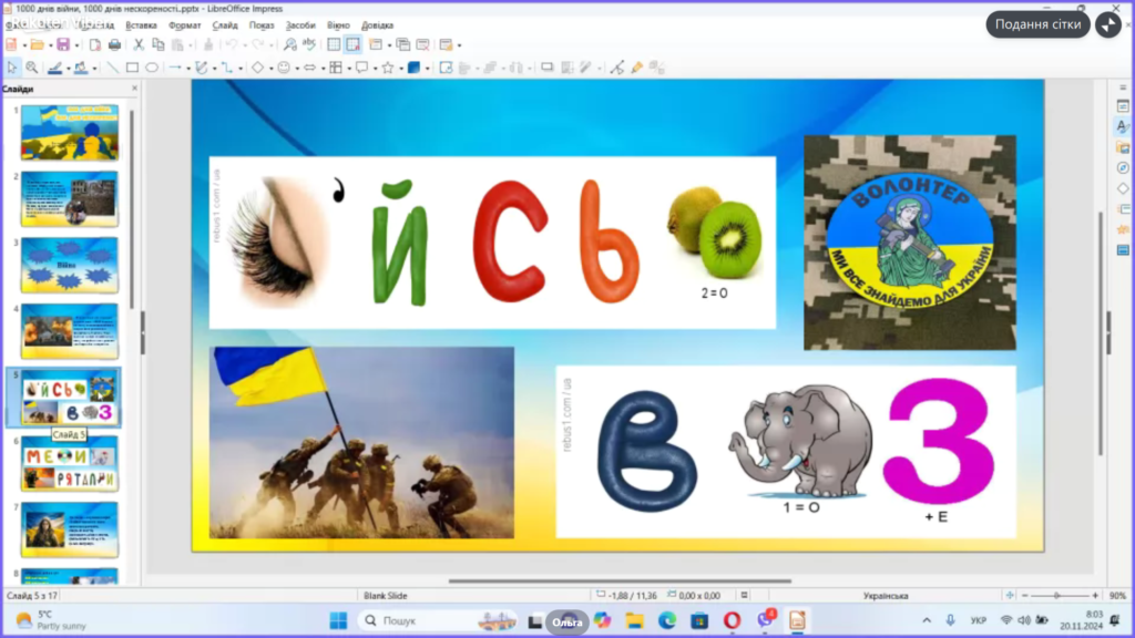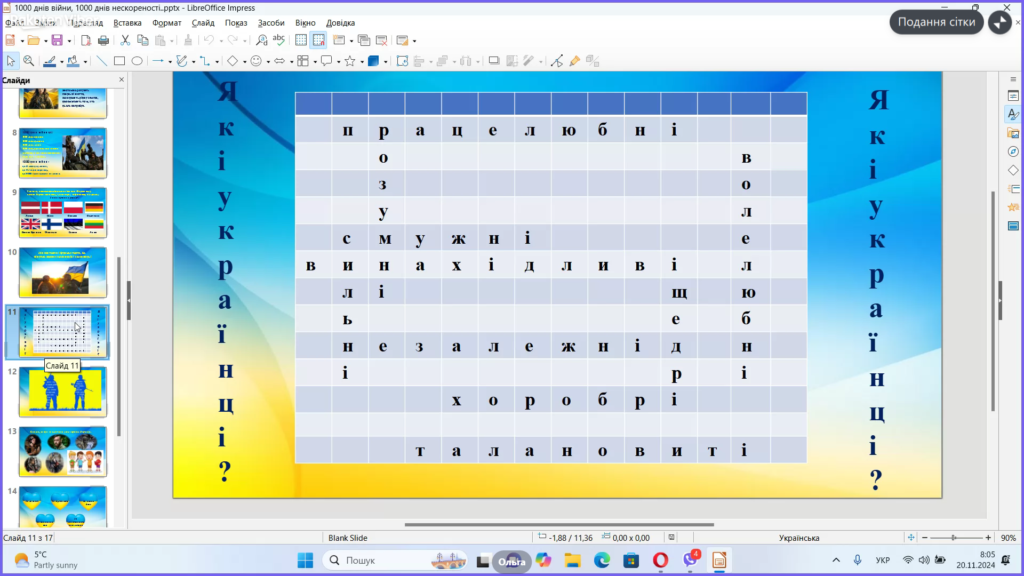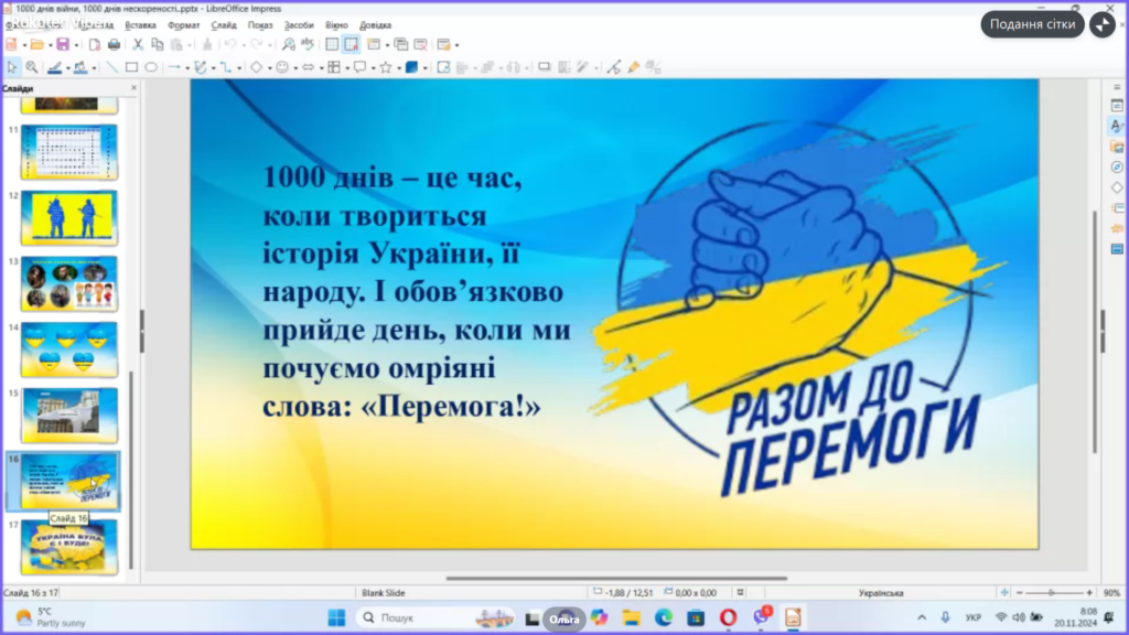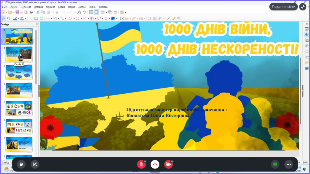 20.11.2024 року в групі № 29 майстер виробничого навчання Косматова Ольга Вікторівна провела виховний захід на тему : «1000 днів війни, 1000 днів нескореності !» Проведений виховний захід став нагадуванням про важливі цінності, які об’єднують нас як народ. Протягом 1000 днів війни український народ демонструє надзвичайну мужність, силу духу та нескореність перед викликами, які постали перед нашою країною.
