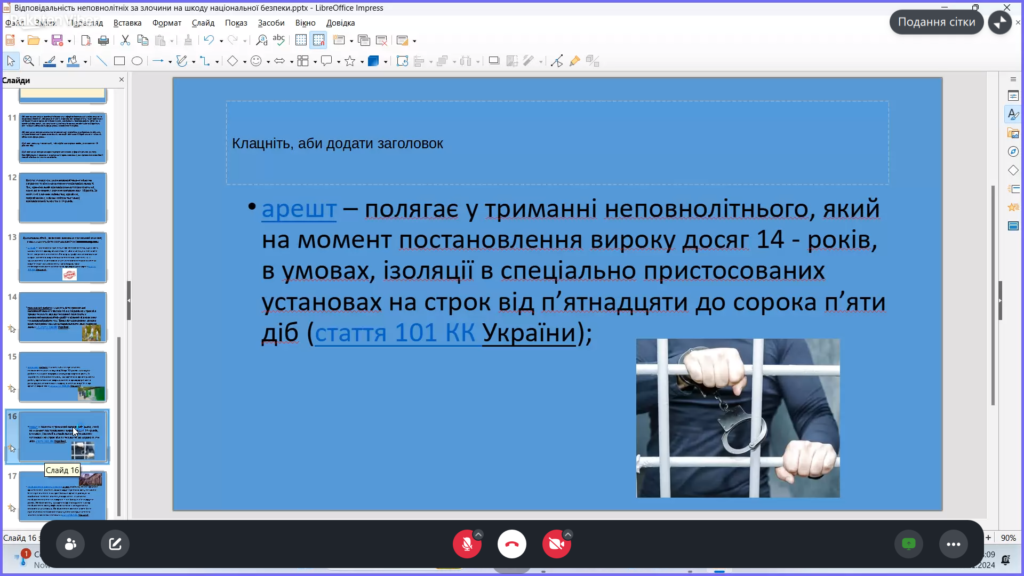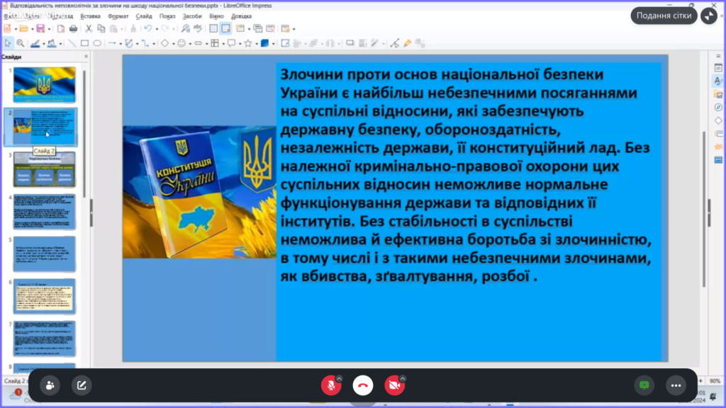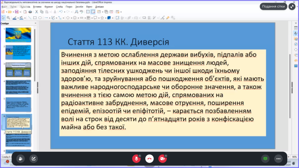 25.11.2024 року майстер виробничого навчання : Косматова Ольга Вікторівна в групі № 29 за професією » Штукатур » провела годину спілкування на тему: «Відповідальність неповнолітніх за злочини щодо національної безпеки» . Здобувачів освіти майстер ознайомила із поняттями злочинів проти національної безпеки та їх видами (державна зрада, шпигунство, диверсія, терористична діяльність).