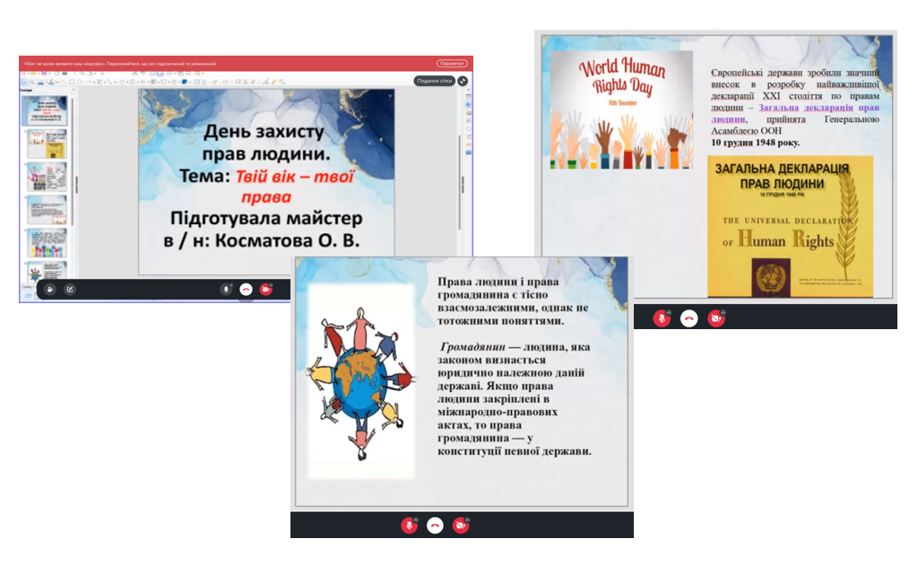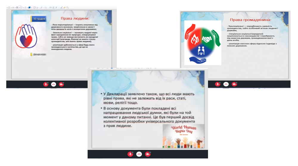 Під час виховного заходу здобувачам освіти було доведено, що Міжнародний День захисту прав людини щорічно відмічається 10 грудня з нагоди відзначення річниці прийняття у цей день у 1948 році Генеральною асамблеєю ООН Загальної декларації прав людини. Звернула увагу здобувачам освіти на особистості, цивільні та політичні права і свободи. Майстер розповіла значення положень Загальної декларації прав людини для формування Конституції України . Акцентувала увагу здобувачів на принципи, які закладені Декларацією. Пояснила здобувачам, що від народження ми маємо певні права, які гарантовані і захищаються державою. В Конституції України, записано всі закони, по яких ми живемо в нашій країні. Давайте перш за все з’ясуємо, що ж таке право?