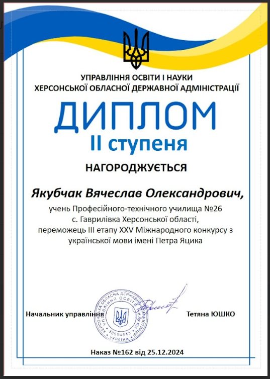 етап XXV Міжнародного конкурсу з української мови імені Петра Яцика за завданнями Комунального навчального закладу «Херсонська академія неперервної освіти» Херсонської обласної ради. Участь у III (обласному) етапі конкурсу взяли 122 здобувачі освіти.