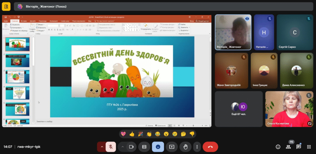 У ПТУ№26 с.Гаврилівка здобувачі освіти зустрілися у дистанційному форматі на інформаційній лінійці до Всесвітнього дня здоров’я , що пройшла в рамках інформаційного місячника «Здорове харчування — крок до здоров’я». Організатори заходу , бібліотекар училища Жовтоног В.О. майстер в/н групи №22 Марич Н.Й. та учні даної групи, розповіли присутнім про тарілку здорового харчування.