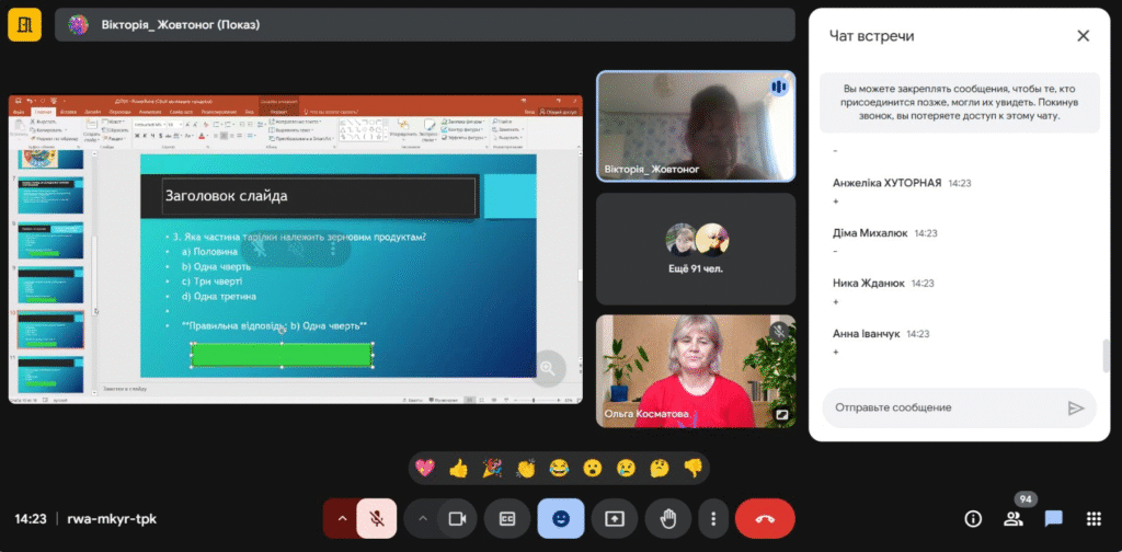 Протягом заходу слухачі дізналися про історію започаткування свята Всесвітнього дня здоров’я, що за даними ВООЗ, 80% захворювань пов’язані з харчуванням. Правильне харчування може покращити самопочуття і знизити ризик серйозних захворювань. Розглянули поняття «Тарілка здорового харчування» та правила формування тарілки. Познайомилися як виглядають тарілки здорового харчування в інших країнах. Закріпили почуті відомості пройшовши невелике тестування. Крім того, під час бесіди учні училища поділилися своїми знаннями про раціональне харчування. Також значна частина здобувачів взяла участь в анонімному опитуванні що до харчових звичок та вподобань , що запропонував Херсонський ОЦКПХ.
