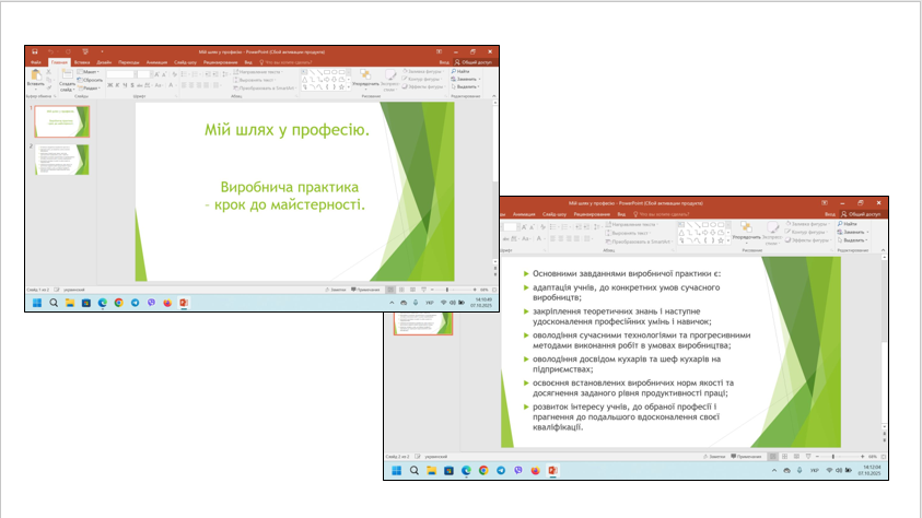 Під такою темою пройшло підсумкове заняття 8 жовтня перед виходом на виробничу практику гр №32 за професією» Кухар.» Майстер виробничого навчання Марич Н.Й нагадала здобувачам освіти правила поведінки на підприємстві, звернула увагу на культуру спілкування з працівниками, повагу до колективу, підкреслила потребу бути уважними та відповідальними, проявляти ініціативу, креативність, сміливо пробувати нове. Також на занятті був присутній викладач з предмету «Технології приготування їжі» Пацкаль О.З. Вона наголосила на важливості застосування теоретичних знань у практичній діяльності: розповіла про правила дотримання технологічних процесів приготування страв; оформлення технологічних карток; збереження якості готових виробів; правила гігієни та санітарії. Здобувачі освіти активно ставили запитання щодо місць проходження практики, режиму роботи, ведення щоденників. Майстер та викладач надали роз’яснення та практичні поради. Було проведено інструктаж із охорони праці та правил поведінки на виробництві. Здобувачів освіти офіційно направлено на виробничу практику відповідно до графіка.