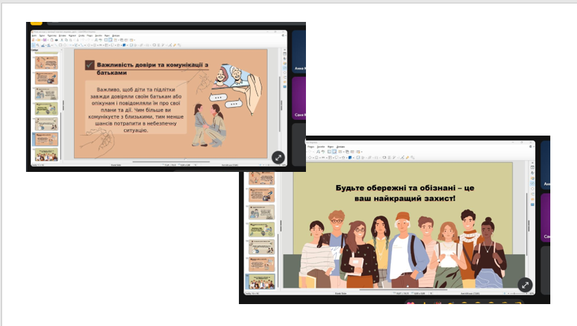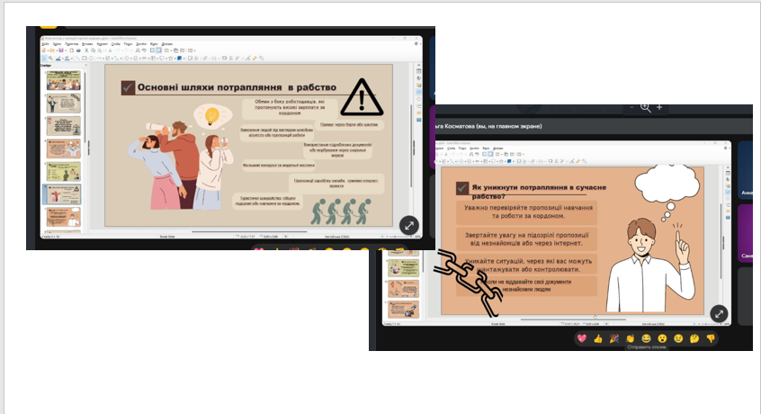 Здобувачі детально вивчили, як злочинці вербують жертв: Обман з боку роботодавців, які пропонують підозріло високі зарплати за кордоном. Туристичні шахрайства або фальшиві пропозиції навчання. Використання підроблених документів або вербування через соціальні мережі. Фальшиві конкурси та модельні кастинги. Примус через борги або шантаж. Здобувачі освіти засвоїли життєво важливі поради: Ніколи не віддавайте свої документи незнайомим людям. Завжди уважно перевіряйте пропозиції навчання та роботи через перевірені агентства. Не довіряйте незнайомцям, які пропонують підозріло вигідні можливості. Завжди повідомляйте своїм близьким про свої плани та місцеперебування. Важливість довіри та комунікації з батьками: Чим більше ви комунікуєте з близькими, тим менше шансів потрапити в небезпечну ситуацію.