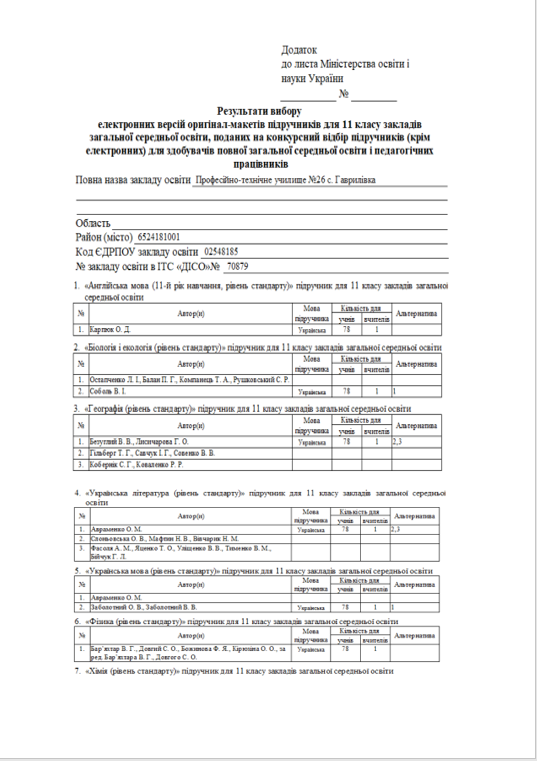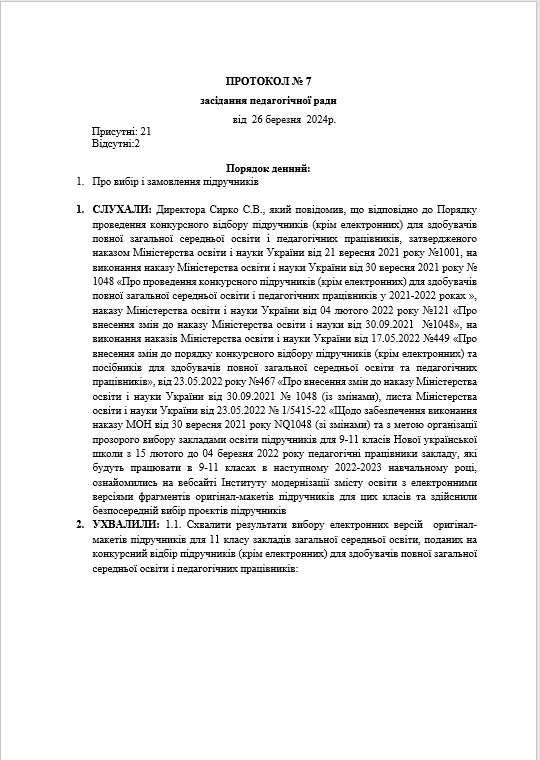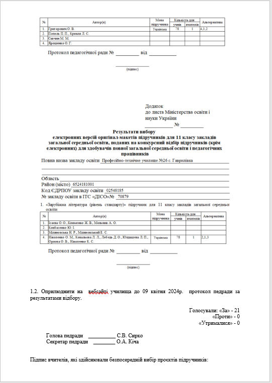 26. 03.24 р. відбулося засідання педагогічної ради . На ньому викладачі загальноосвітніх предметів підтвердили свій вибір підручників для 11 класу. Протокол додається.